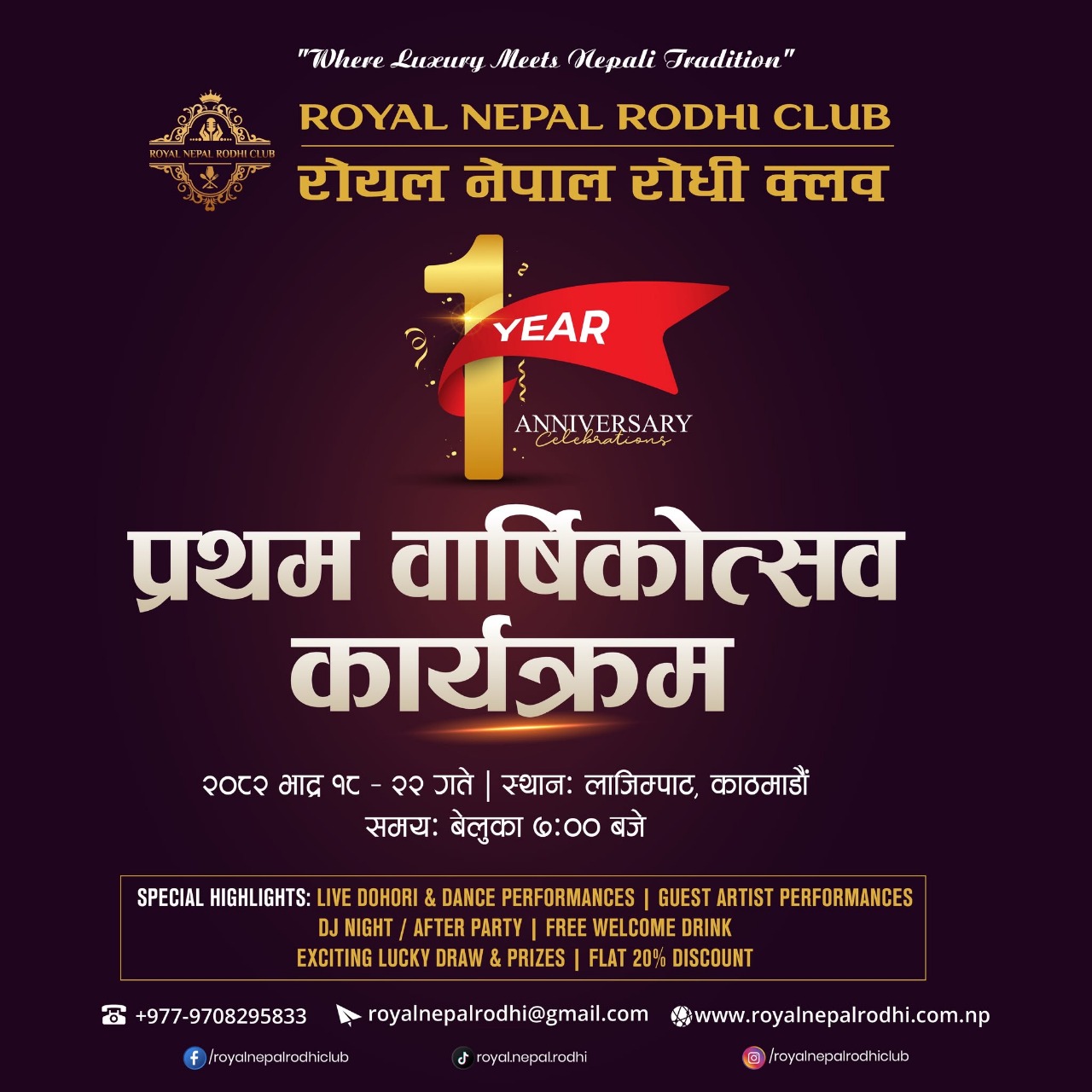 काठमाडौं – नेपालको मौलिक रोधी संस्कृतिलाई आधुनिक आतिथ्यसँग संयोजन गर्ने उदेश्यसहित स्थापना गरिएको रोयल नेपाल रोधी क्लब ले आफ्नो प्रथम वार्षिकोत्सव भव्य शैलीमा मनाउँदैछ। लाजिम्पाटस्थित क्लबले भदौ १८ गतेदेखि २२ गतेसम्म पाँच दिने विशेष कार्यक्रम गरी वार्षिकोत्सवलाई उत्सवमय बनाउने तयारी गरिरहेको छ ।
